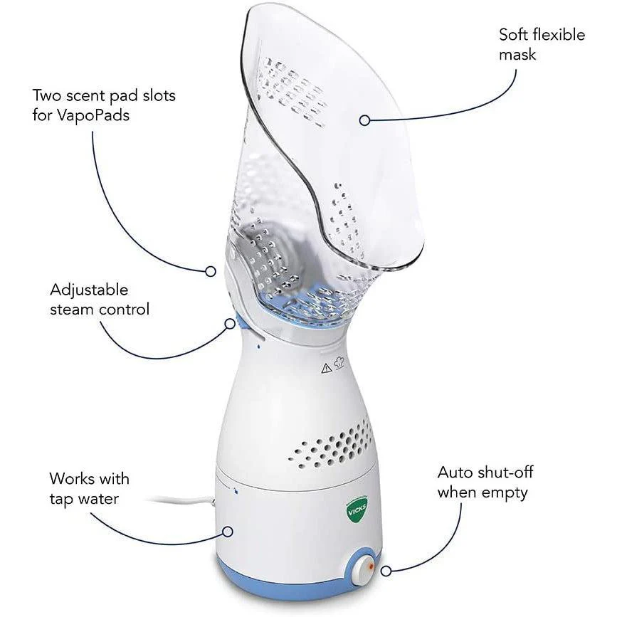 Steam inhalation helps penetrate nasal, sinus and throat passages to help naturally alleviate dryness and discomfort caused by cold. The electrical Sinus Inhaler delivers warm, soothing steam to naturally and effectively help easy breathing. It is designed to exclusively work with VapoPads to provide soothing menthol vapors for added comfort.